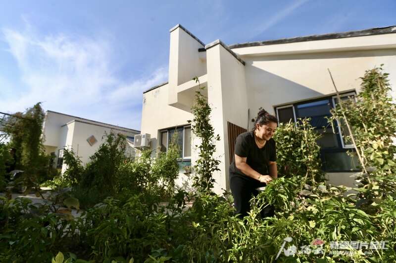 8月28日,乌尔禾镇海棠别院,居民在采摘蔬菜。