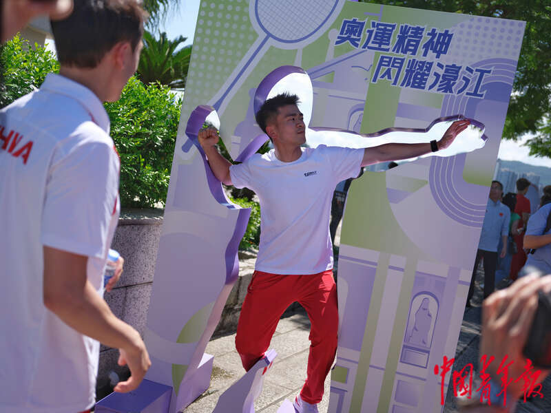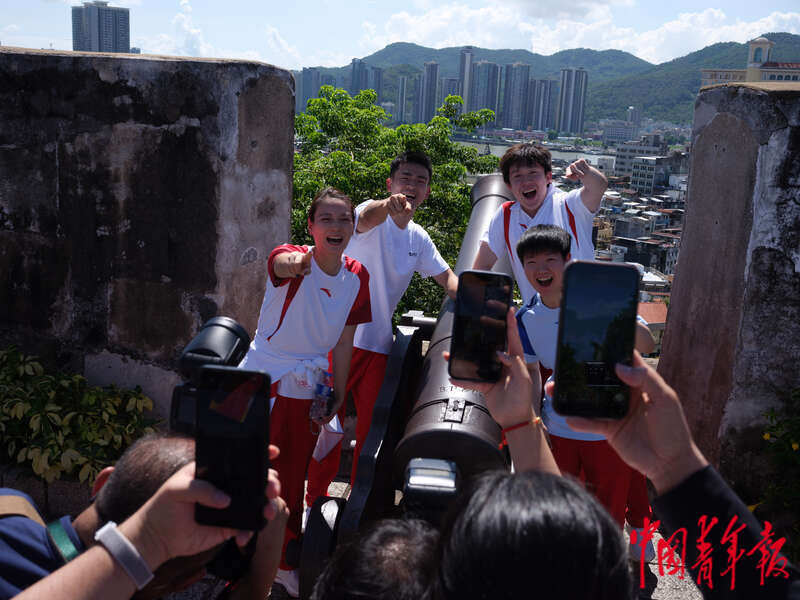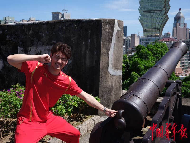 9月1日下午,中国澳门,大炮台景点,巴黎奥运会羽毛球混双冠军郑思维在山顶打卡合影。中青报·中青网记者 李隽辉/摄
