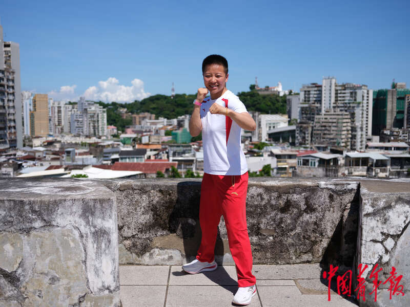 9月1日下午,中国澳门,大炮台景点,巴黎奥运会拳击女子50公斤级冠军吴愉在山顶拍照留念。中青报·中青网记者 李隽辉/摄