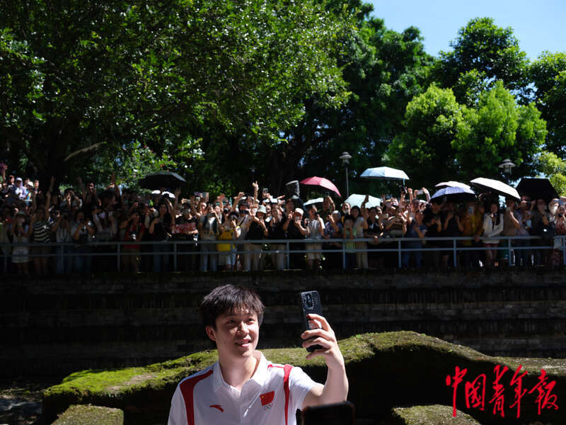9月1日,中国澳门,大炮台景点,活动结束后,王楚钦自拍与粉丝合影。中青报·中青网记者 李隽辉/摄