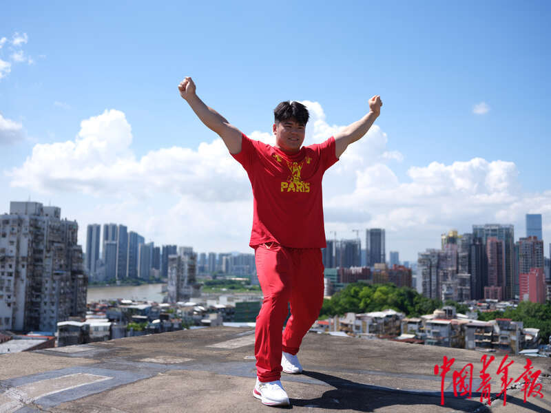 9月1日,中国澳门,大炮台景点,巴黎奥运会举重男子102公斤级冠军刘焕华在山顶摆出举重动作拍照。中青报·中青网记者 李隽辉/摄