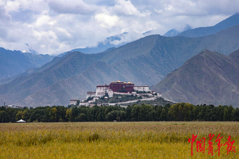 9月1日,西藏拉萨市,从拉鲁湿地国家级自然保护区远眺布达拉宫,苍翠的绿与耀眼的黄交织,为这座拥有1300年历史的古建筑披挂上一抹秋色。