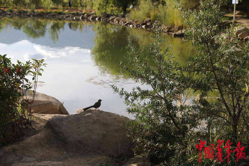 9月1日,西藏拉萨市南山公园,一只灰腹噪鹛停在湖边的石头上。中青报·中青网记者 孔斯琪/摄