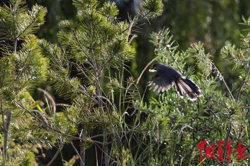 9月1日,西藏拉萨市南山公园,一只灰腹噪鹛在树丛间飞舞。中青报·中青网记者 孔斯琪/摄