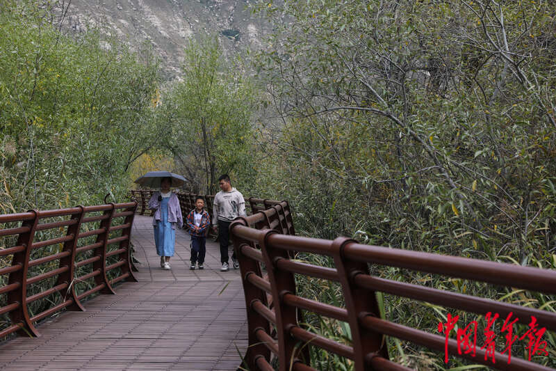 9月1日,西藏拉萨市拉鲁湿地国家级自然保护区巡护步道,一家人利用周末时间前来散步。拉鲁湿地巡护步道于2024年5月1日起免费向公众开放,市民、游客可以在10余公里长的道路上欣赏雪域高原的生态美景。中青报·中青网记者 孔斯琪/摄