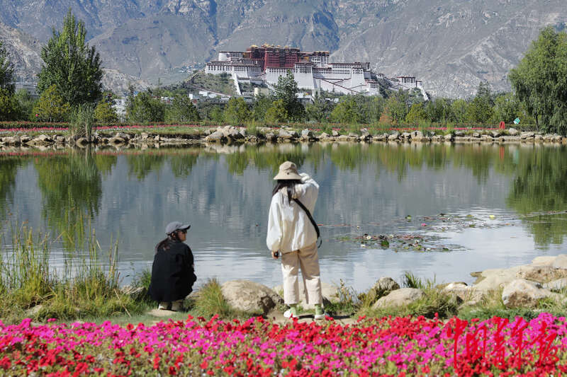9月1日,西藏拉萨市南山公园,游客在镜湖边欣赏布达拉宫的景色。中青报·中青网记者 孔斯琪/摄