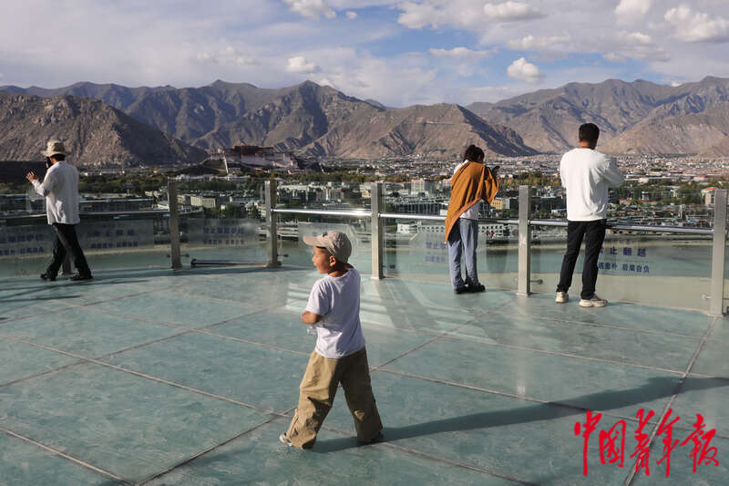 9月1日,西藏拉萨市南山公园,游客们在观景台上远眺拉萨市区。中青报·中青网记者 孔斯琪/摄