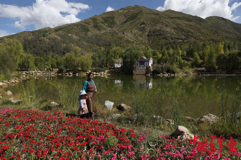 9月1日,西藏拉萨市南山公园,达瓦祖姆带着2岁的孙女在镜湖边游览。这里曾经是一座光秃秃的石头山,2012年,拉萨市启动南山造林绿化工程。一开始只能靠人背马驮将客土和树苗运上山,经过当地十余年的努力,荒山变身青山。如今,南山公园栽植各类苗木120余万株,在涵养水源、保持水土、固碳释氧、净化空气等方面带来生态效益,也成为了市民、游客休闲游憩、旅游观光的好去处。中青报·中青网记者 孔斯琪/摄