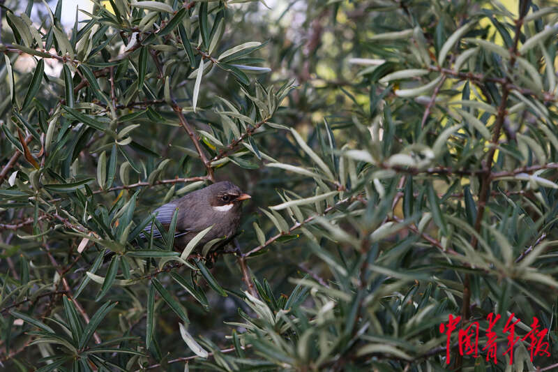 9月1日,西藏拉萨市南山公园,一只灰腹噪鹛在沙棘丛中觅食。中青报·中青网记者 孔斯琪/摄
