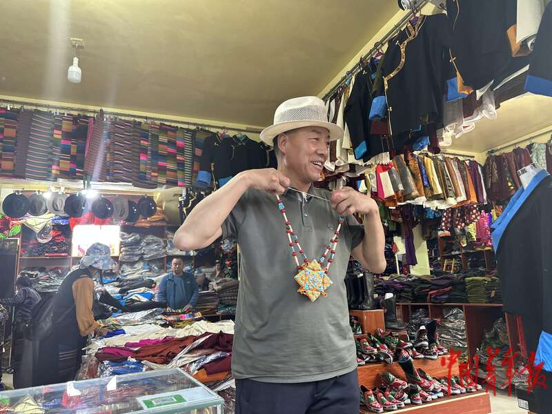 马尕东的两家服装店就在他家楼下,一家卖藏族服装,一家卖现代服饰,店铺里服装款式多样、物美价廉。9月2日,中青报·中青网记者看到陆续有人来选购服装,店员告诉记者,“也有游客来买藏族服装。”马尕东拿起店里的一款精美的藏式项链,一边佩戴一边展示。