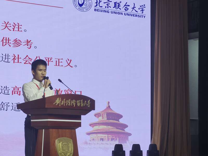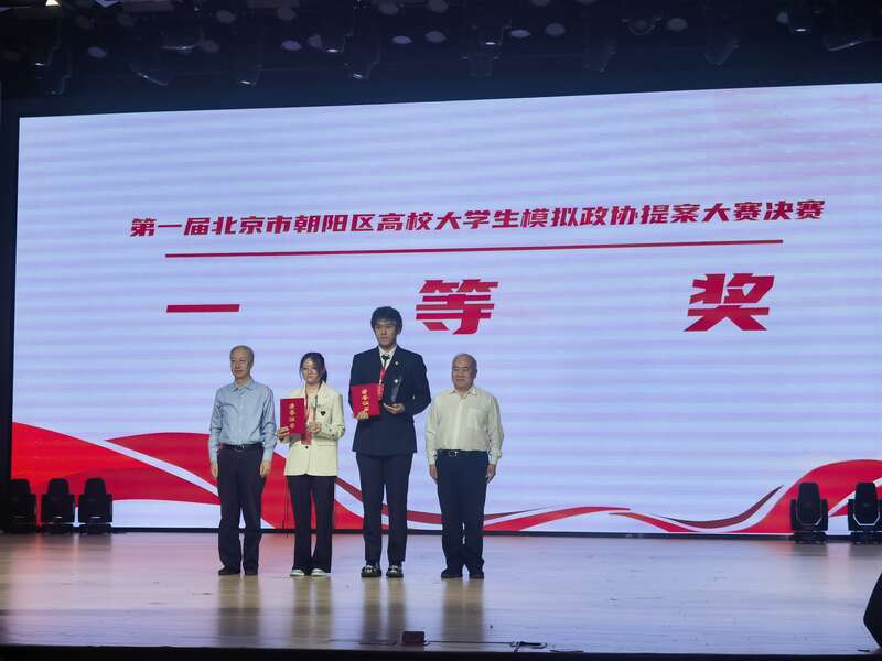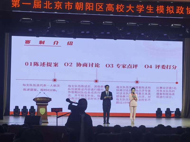 9月26日,第一届北京市朝阳区高校大学生模拟政协提案大赛在对外经贸大学举行,来自15所高校的大学生穿着正装走上舞台,以准政协委员的姿态陈述提案。