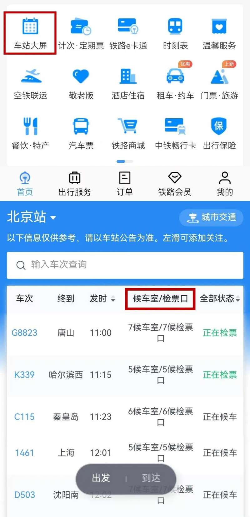 查找所乘列车在哪个检票口检票