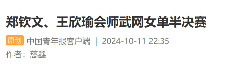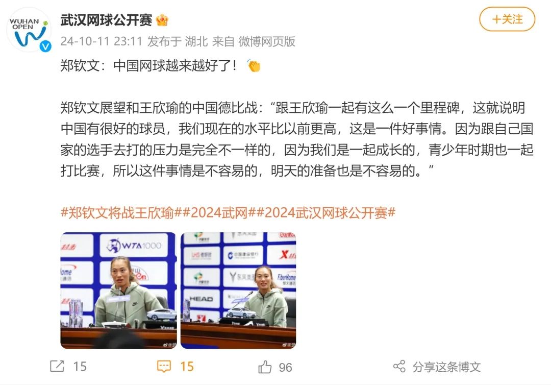 郑钦文恭喜王欣瑜取得了突破,她说:“王欣瑜在这站比赛的感觉非常好。来到半决赛阶段,没有选手是弱的。我们都是中国选手,所以下场比赛现场观众可以好好享受比赛了。”