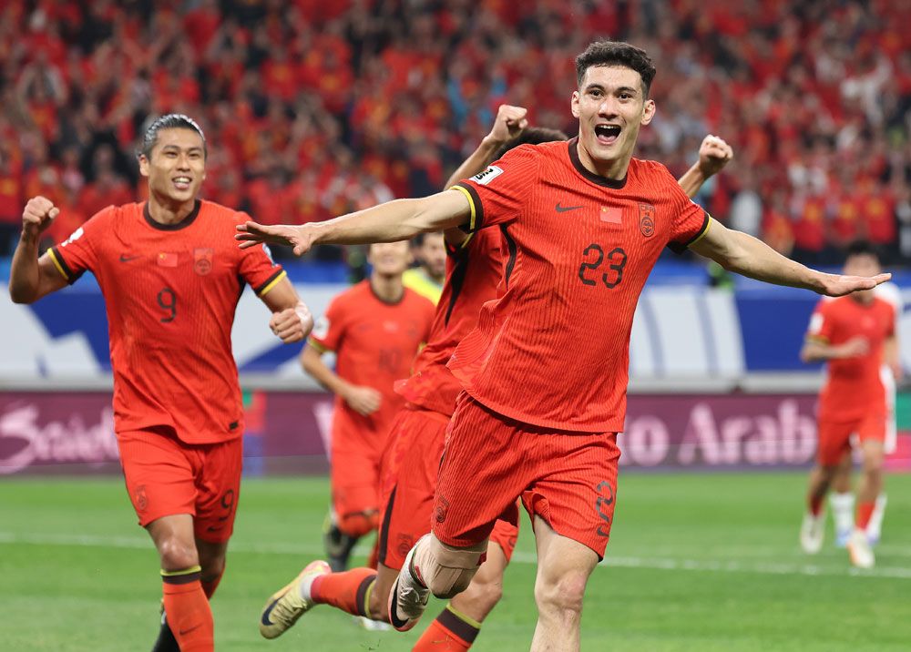 中国队23号拜合拉木破门后与队友奔跑庆祝。