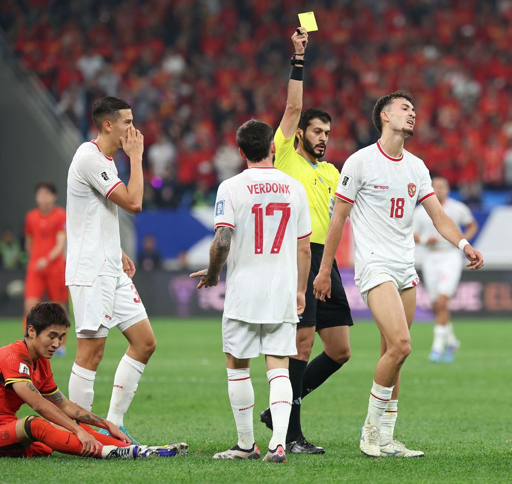 印尼队18号JENNER对中国队韦世豪(左一)犯规被出示黄牌。