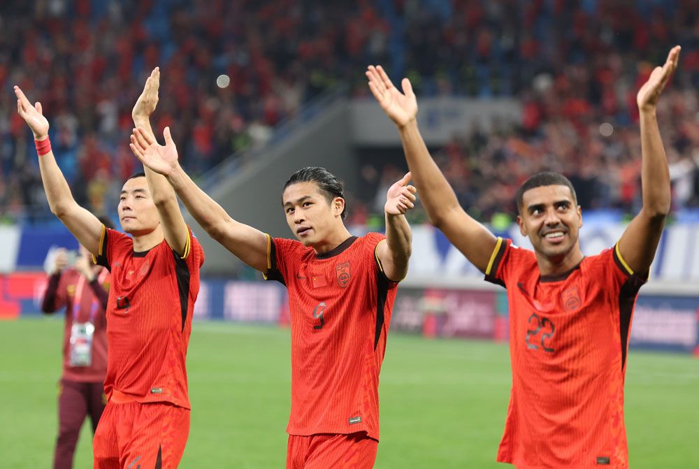 3比赛结束后,中国队队员(从左至右)李磊、张玉宁和阿兰向球迷致意。