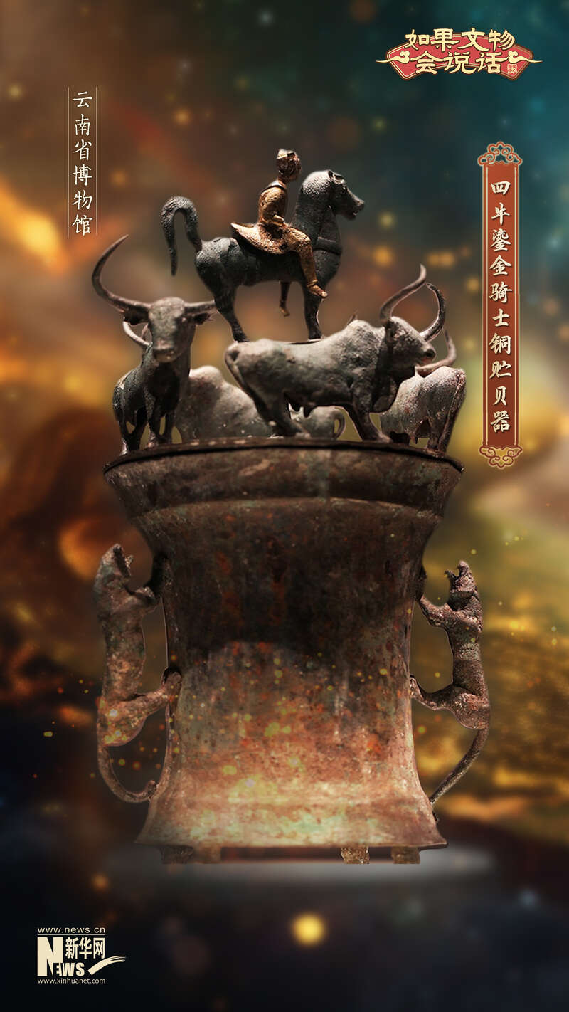 眼前的这件四牛鎏金骑士铜贮贝器造型优美