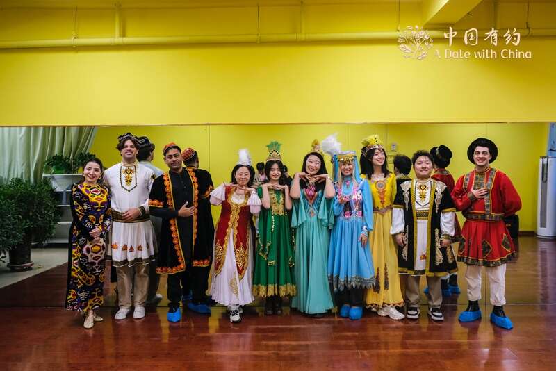 采访团一行身着民族服饰沉浸式感受舞蹈的魅力。