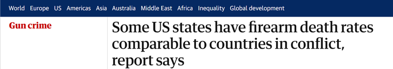 以美国密西西比州为例,该州2021年与枪支有关的暴力事件发生率为每十万人中28.5起,几乎是海地(每十万人中15.1起)的两倍,后者深受政治和帮派冲突的困扰。再比如,罗德岛州是美国枪支死亡率最低的州,为每十万人中3人死亡,但比英国的每十万人中0.13人高出惊人的23倍。