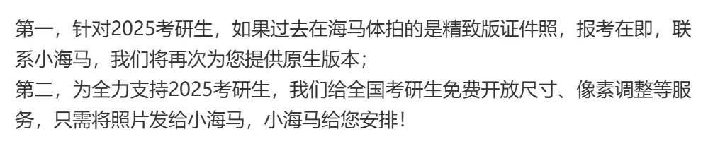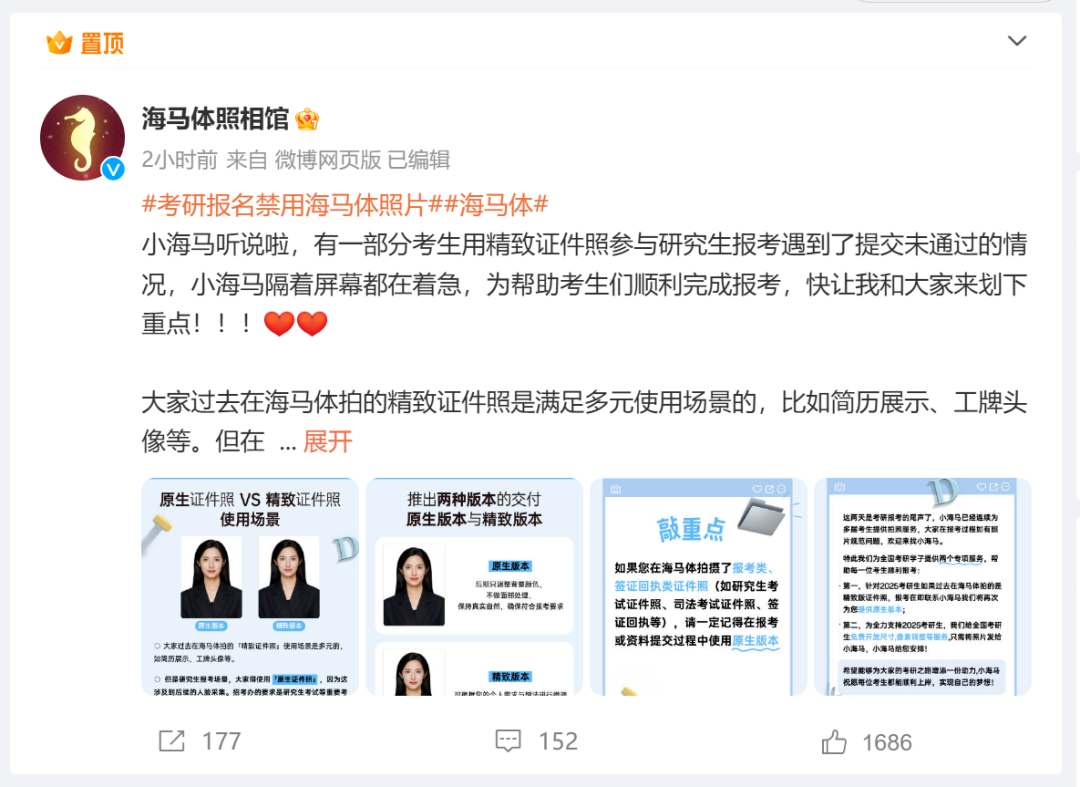 5日中午,微博@海马体照相馆 发布回应称:“在研究生报考场景中,大家务必使用原生版证件照,因为这涉及到后续的人脸采集。招考办的要求是研究生考试等重要考试的证件照,需符合无修图、无浓妆、自然真实的标准,宽高比例3:4 ,JPG或JPEG格式,大小不超过10M。”并给出两个解决方案:提供精致版证件照的原生版本;给全国考研生免费开放尺寸、像素调整等服务。
