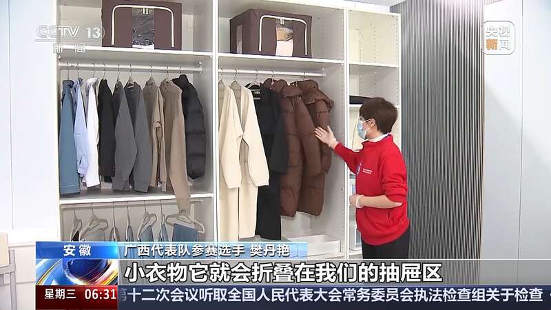 广西代表队参赛选手 樊丹艳:衣橱里面提倡能挂不叠,挂的同时还会分上半身,下半身的短衣区,还有我们的裙子到膝盖的中长衣区,还有长衣区长裙子,小衣物它就会折叠在我们的抽屉区。其实冰箱会有一个很核心的东西,什么东西可以进冰箱,什么东西不可以进冰箱,我们要做空间规划设计,你要了解食物的储藏方式和保鲜的各种方式。