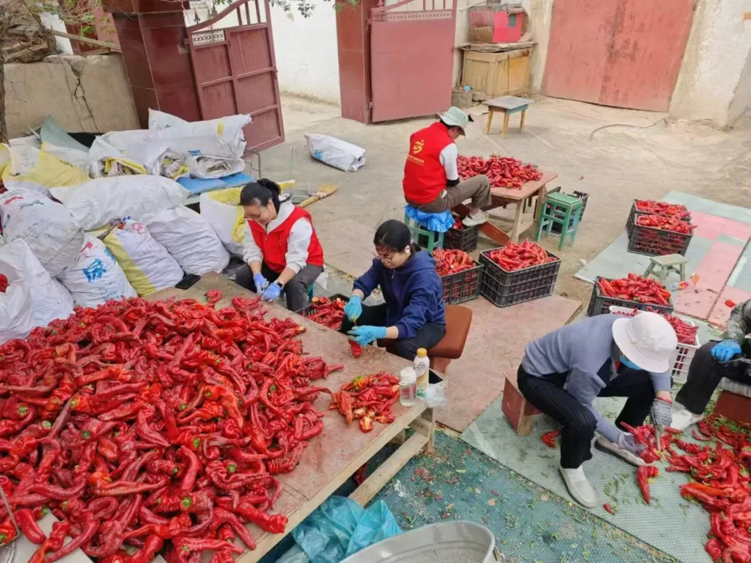 2024年8月,新疆哈密巴里坤哈萨克自治县三塘湖镇下湖村,500亩特色辣椒喜迎丰收,西部计划志愿者走进农户家中帮忙剪辣椒、晒辣椒。(供图/2024年新疆生产建设兵团西部计划志愿者 张梅)