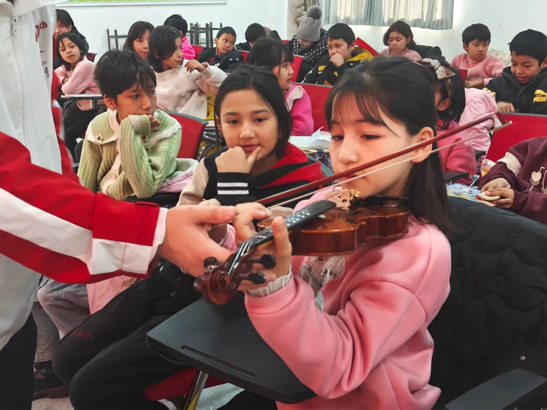 2024年1月20日 新疆喀什泽普县,大学生西部计划志愿者刘桓东在库其社区教小朋友们拉小提琴。(摄影/聂涛)