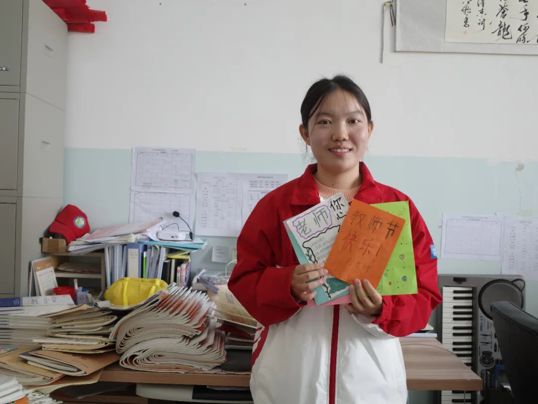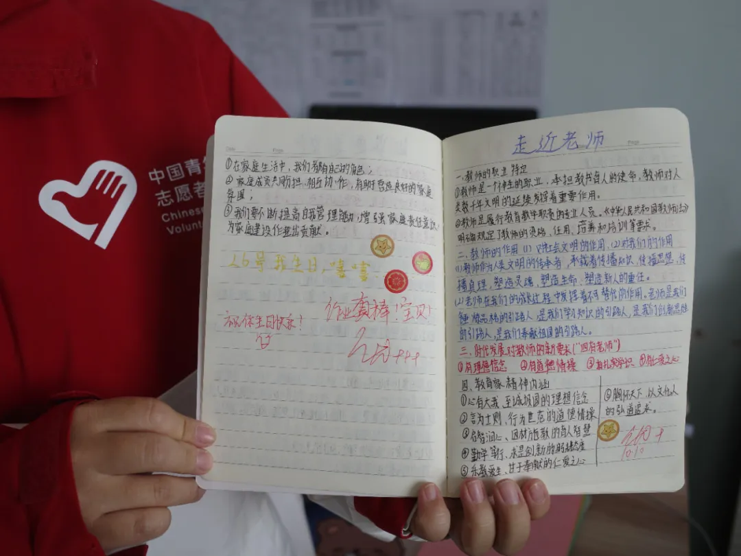 2024年10月15日 阿勒泰地区布尔津县布尔津初级中学,天津大学研究生支教团成员刘骁,展示教师节期间学生们送的贺卡以及与学生的作业互动。(摄影/团中央新媒体中心 张国党)