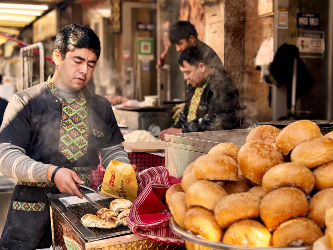 2024年10月19日 乌鲁木齐市,街边新疆大叔正在烤包子。(摄影/团中央新媒体中心 牛晓乐)