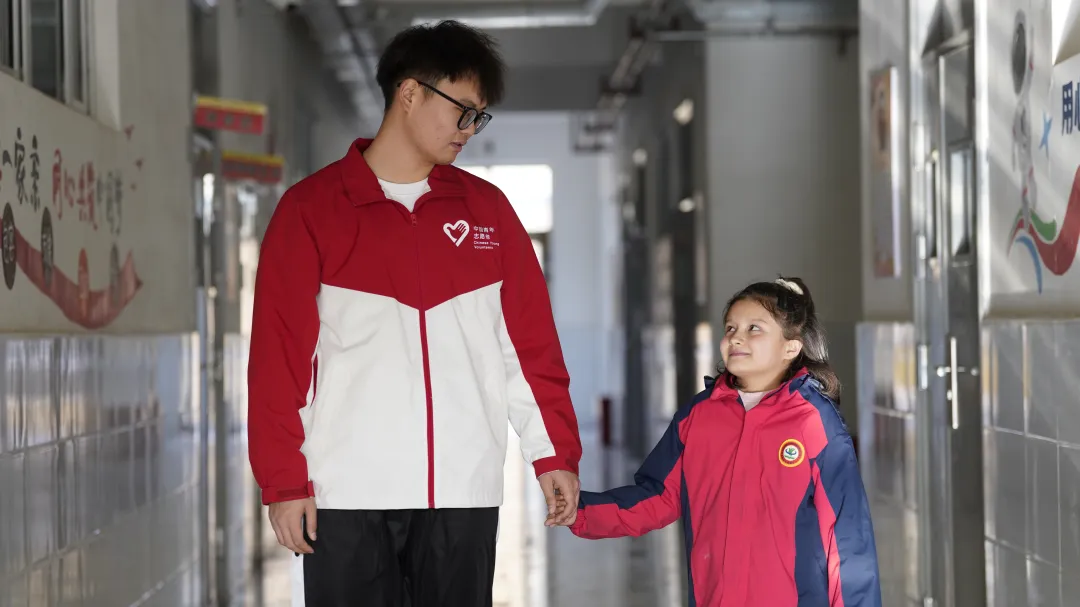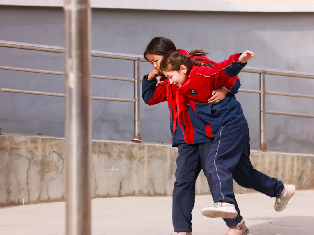 2024年10月23日 新疆克州哈拉峻乡谢依特小学。上课铃声响起,两个三年级同学开心回教室。(摄影/团中央新媒体中心 蒋璐吉)