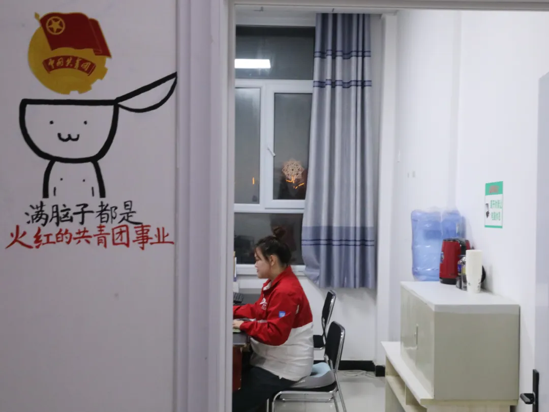 2024年10月12日 服务于哈巴河县的西部计划志愿者认真工作,门外墙上是志愿者们手绘的表情包。(摄影/团中央新媒体中心 张国党)