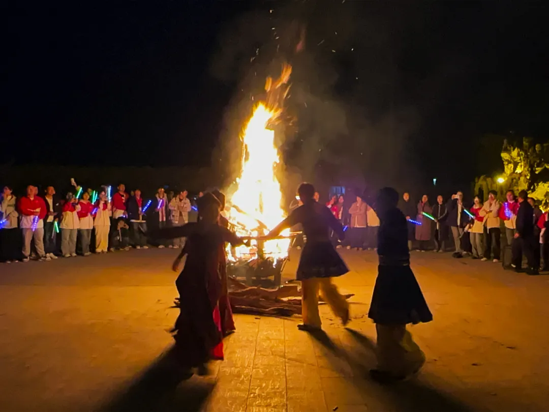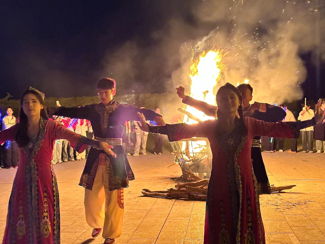 2024年10月23日 新疆哈密伊吾县,伊吾团县委组织开展2024年西部计划志愿者“同心逐梦·驰志伊吾"青马工程研学暨“奔跑吧,团团”(第三期)活动,西部计划志愿者们在篝火前学跳民族舞蹈。(摄影/团中央新媒体中心 韩志博)