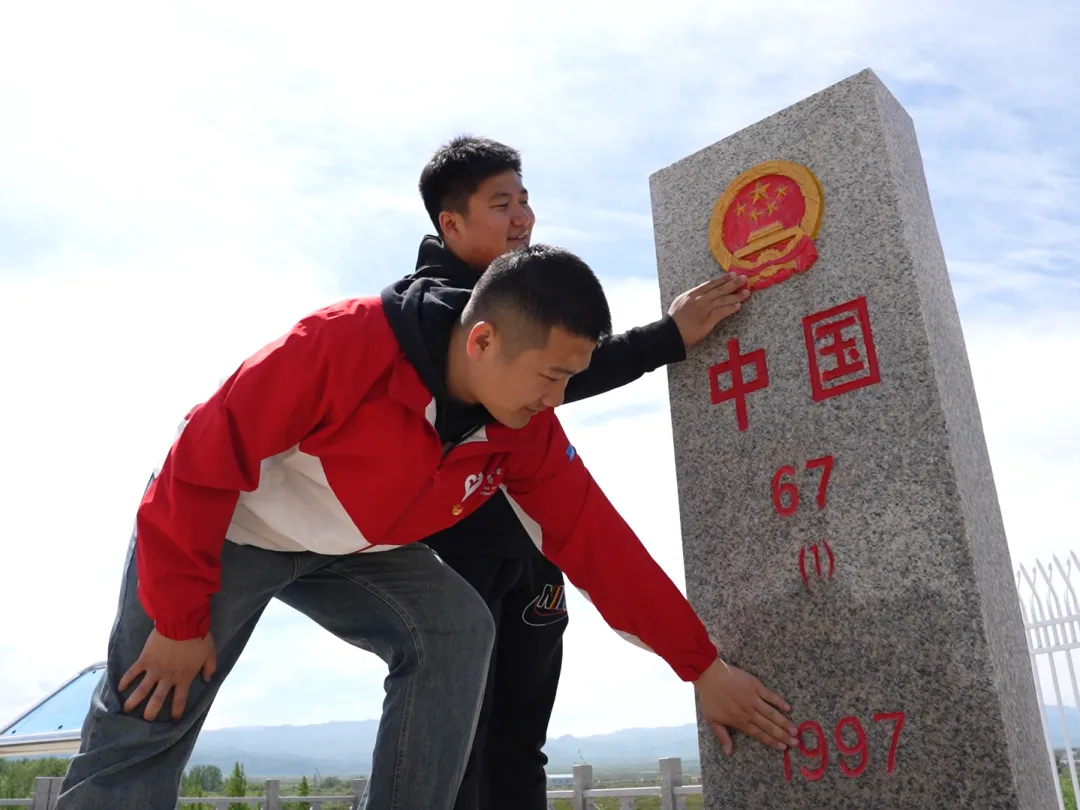 2024年5月,共青团吉木乃县委员会开展“重走长征路”主题活动,两名西部计划志愿者瞻仰抚摸中哈67号界碑。(摄影/2023年西部计划志愿者 刘宇)