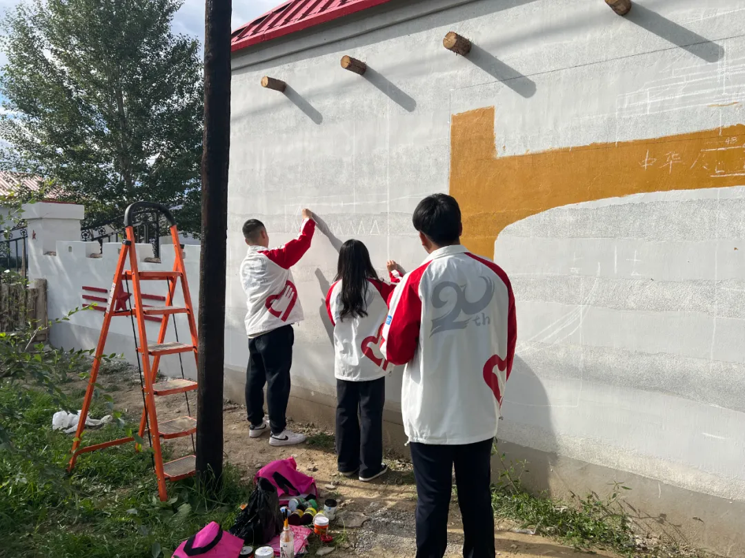 2023年10月 西部计划志愿者们自发前往中哈边境第一村——萨尔乌楞村,为当地群众绘制墙画。(摄影/2023年西部计划志愿者 刘宇)