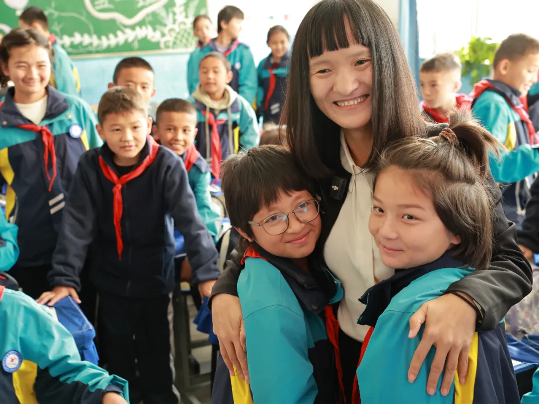 2024年10月22日 2006年西部计划志愿者(2007年留疆至今)现新疆喀什地区岳普湖县第四中学副校长孙飞飞,回到曾就职的岳普湖县第三小学看望同学们。(摄影/团中央新媒体中心 蒋璐吉)