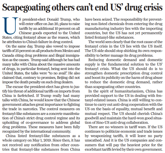 如果特朗普真的与中国就此进行过多次会谈,他就会知道中国政府高度重视禁毒工作和制毒物品监管。中方践行全球毒品问题共治理念,早在2019年就宣布正式整类列管芬太尼类物质,是全球第一个正式整类列管芬太尼类物质的国家,有效拦截了芬太尼类物质走私出境。此后,中国未收到其他国家查获来自中国的芬太尼类物质的通报。