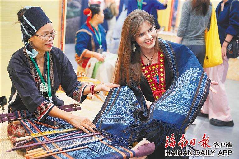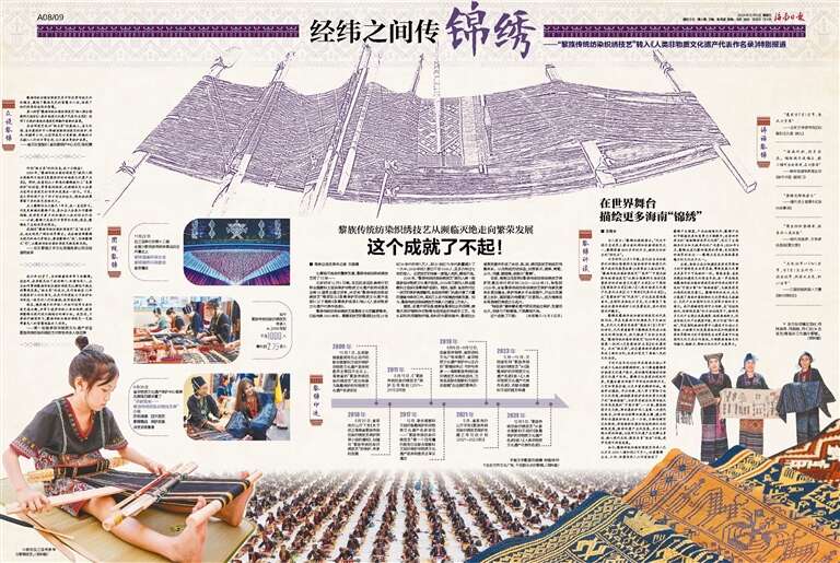 如今,黎族传统纺染织绣技艺传承人已从不足1000人增加到2万多人,36家黎锦企业、工坊、非遗传承人工作室组成了黎锦产业联盟,产品远销海内外,黎锦产品的市场接受度和竞争力不断提升;连续四年举办的“海南锦绣世界文化周”,吸引了全国相关行业和文旅单位的广泛参与;2024年9月,黎锦走进巴黎时装周的秀场,受到国际时尚界的关注……黎锦正在成为海南最具魅力的文化名片之一。