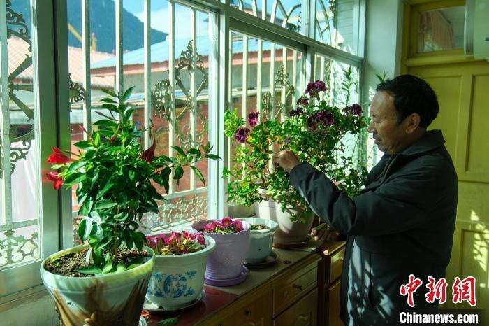 今年62岁的益西四郎是西藏波密县居民,如今已经退休,他见证了川藏公路波密段几十年间的变化。图为12月14日,益西四郎在家打理花草。记者 江飞波 摄
