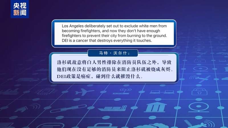 保守派评论员、右翼播客主持人马特·沃尔什也在社交媒体上称,“洛杉矶故意将白人男性排除在消防员队伍之外,导致他们现在没有足够的消防员来阻止洛杉矶被烧成灰烬。DEI政策是癌症,碰到什么就摧毁什么。”