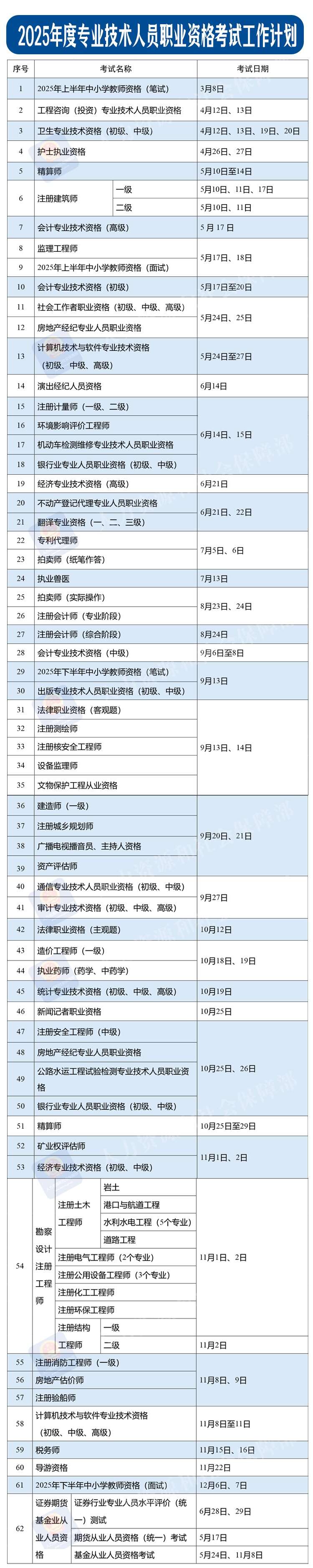 定了!2025年度专业技术人员职业资格考试时间表公布