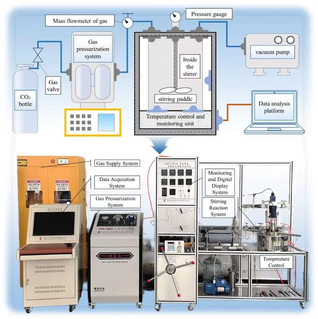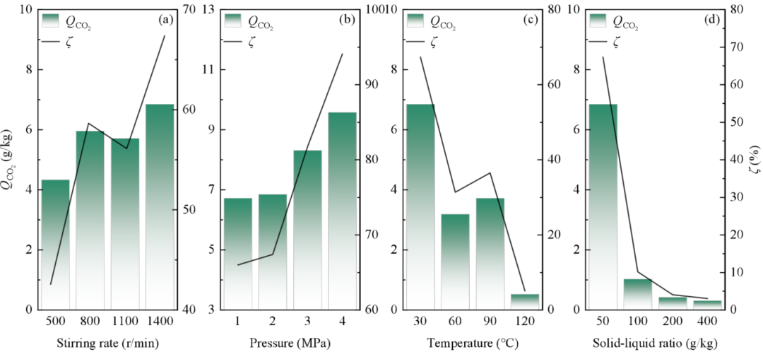 谢和平院士团队在该研究中改良设计了密闭固碳搅拌反应釜,通过开展湿法搅拌固碳试验探究了煤矸石固废本身的固碳性能,分析了固碳性能与搅拌速度、反应温度、CO₂ 气压、固液比的相关程度,为负碳充填材料设计应用提供了理论支撑。