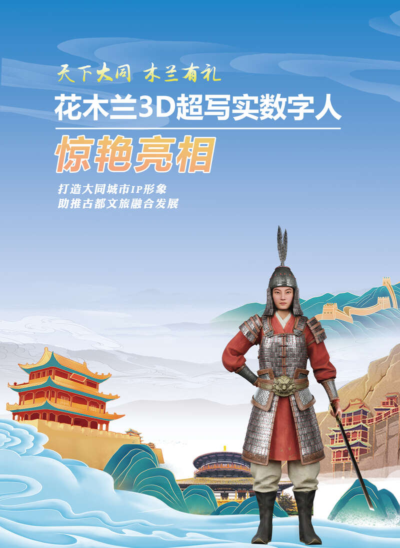 木兰传奇故事与大同这片土地紧密相连。中华书局在成功推出苏东坡、李白、李清照等 3D 超写实数字人的基础上,与大同市携手挖掘乐府双璧之一的《木兰辞》。2024年5月11日,在大同市委宣传部的指导下,“天下大同 木兰有礼”文化创意设计大赛启动,吸引众多创作者踊跃投稿。7月19日,大同市委宣传部与中华书局签署战略合作协议,大同日报传媒集团与古联(北京)数字传媒科技有限公司签署“花木兰 3D 超写实数字人”定制开发及衍生服务合作协议。2024年底,项目通过专家组验收。