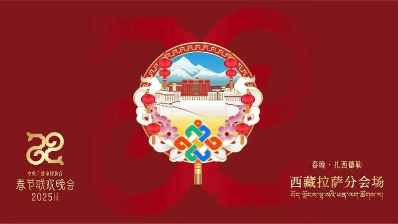 据介绍,总台2025年春晚西藏拉萨分会场标识以“春晚·扎西德勒”为主题,中心是布达拉宫与雪山,展现西藏风光;外形为圆,寓意团圆;四周融入长城纹样,彰显西藏与祖国不可分割。