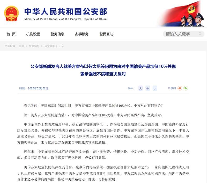 公安部新闻发言人就美方宣布以芬太尼等问题为由对中国输美产品加征10%关税表示强烈不满和坚决反对
