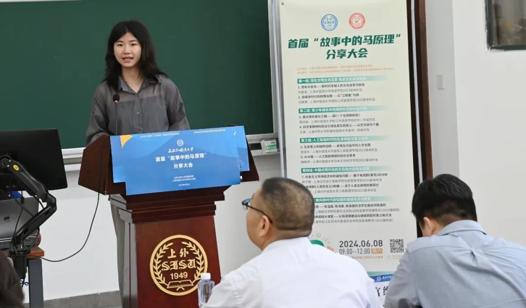 分享会不囿于小课堂空间,而是招募来自不同专业、不同学校的学生加入上外的马原理思政课堂,中学生、大学生,一起在思政课老师“陪练”指导下,针对不同主题准备原创故事进行演示分享,通过分析经典文本和社会热点,将马克思主义基本原理转化为贴近生活的语言,从故事中学习并阐释“马原理”,从思政课堂的聆听者真正变成了“主讲人”,也为大中小学思想政治教育一体化提供创新路径。