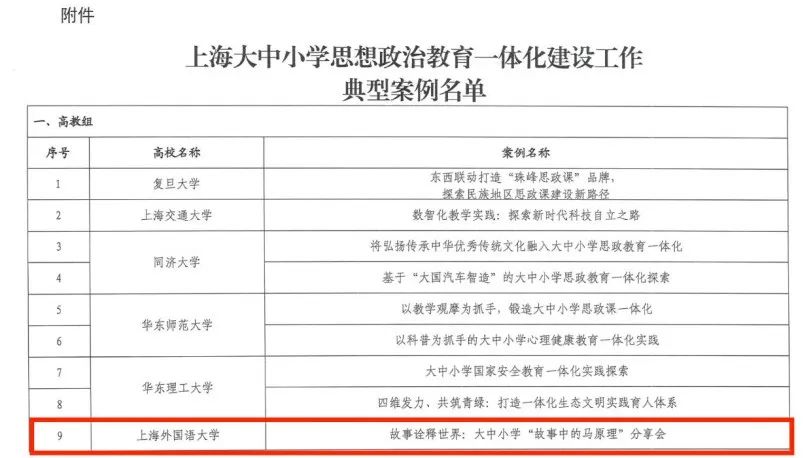 近日,中共上海市教育卫生工作委员会、上海市教育委员会公布了大中小学思想政治教育一体化建设工作典型案例,上海外国语大学报送的“故事诠释世界——‘故事中的马原理’分享会”(以下简称“故事诠释世界”)入选。