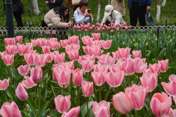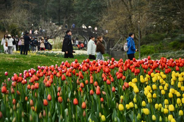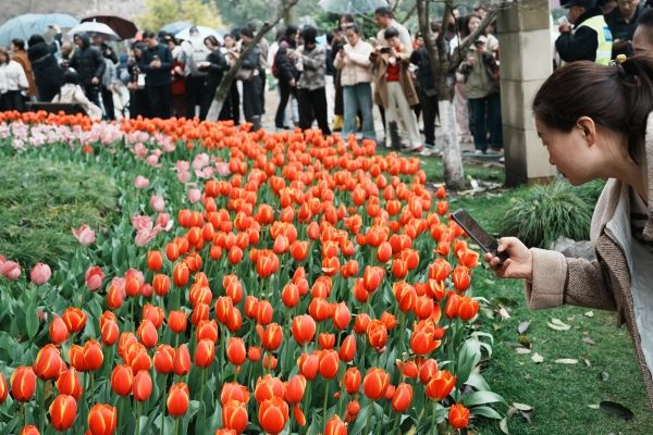 2025年3月16日,浙江省杭州市,西湖区太子湾公园每年三月的郁金香花展吸引了成千上万的游客打卡拍照。40万株郁金香大部分已含苞待放,三月下旬将全面盛开,呈现万紫千红的美丽景象。