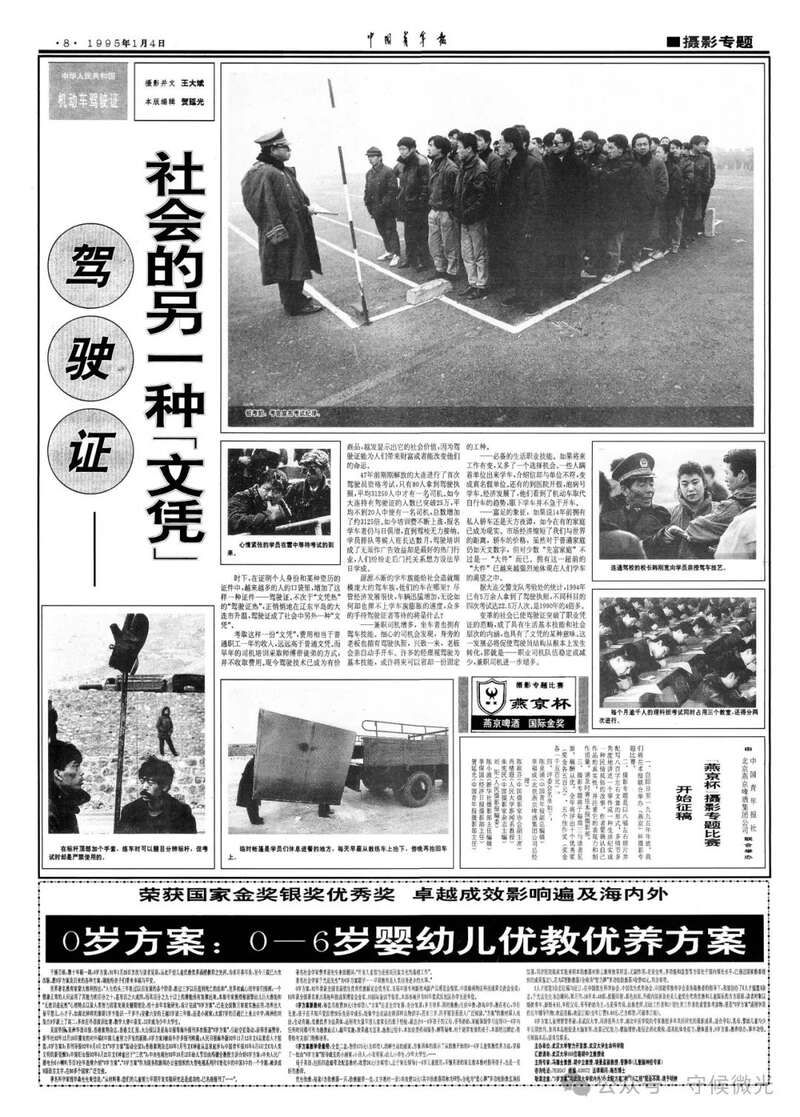 1995年1月4日,《中国青年报》第8版整版刊登了摄影专题《驾驶证——社会的另一种文凭》,生动展现了20世纪90年代辽宁大连的学车热潮。作者为时任大连日报社摄影记者王大斌,编辑是中青报原摄影部主任贺延光。