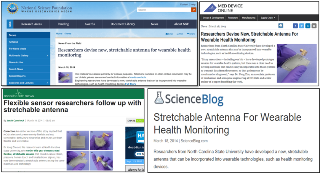 关于银纳米线柔性传感的工作曾获得美国17家知名学术及科技媒体报道