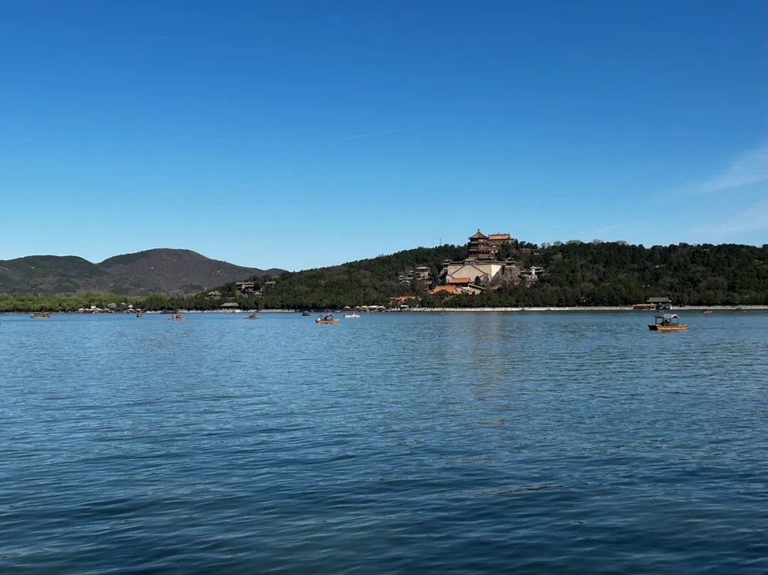 从颐和园南如意门、西门入园,青松翠柳百花盛开,白花山碧桃、连翘、丁香点缀其间,豳风桥沿线品霞桃、品虹桃正值最佳观赏期,桃花灼灼吸引不少游客留下“临水照花”的美图。走上知春岛,仲春时节的西山映入眼帘,垂柳拂面,佛香阁、十七孔桥点缀在昆明湖畔,游船在湖面上泛起波光粼粼。